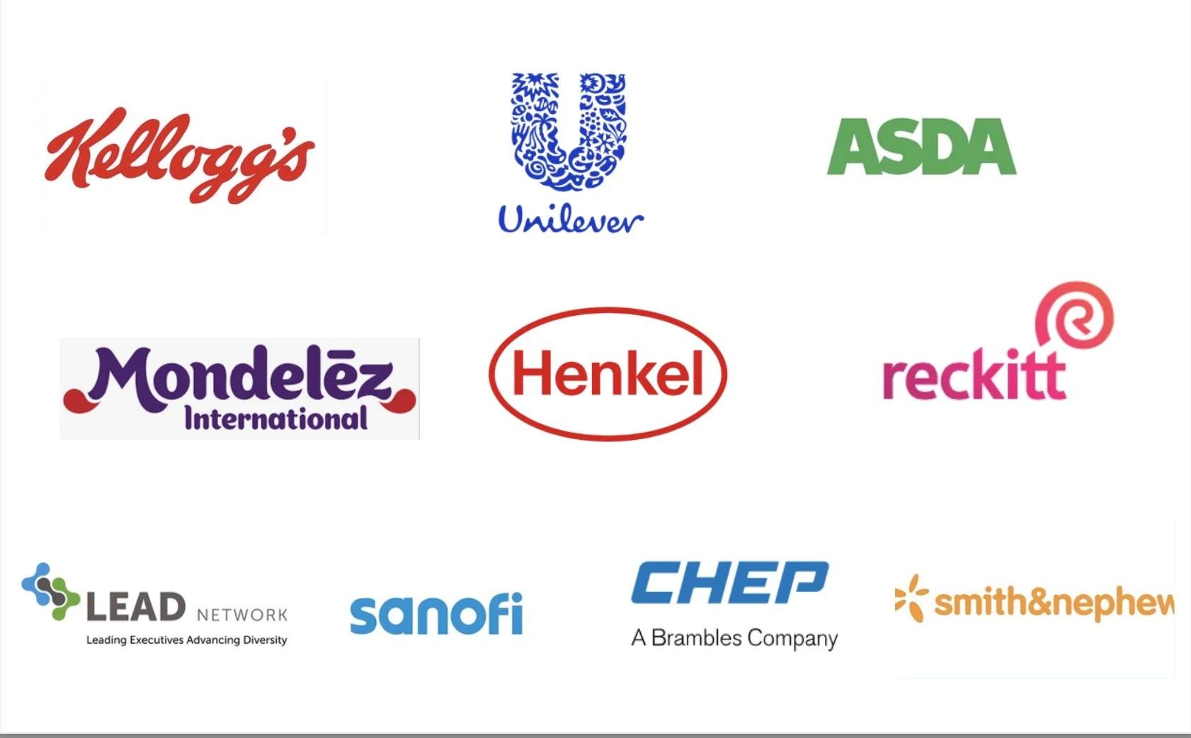 Kelloggs • Unilever • Pepsi • Henkel • ASDA • Reckitt • Smith+Nephew • Mondelez • Sanofi •